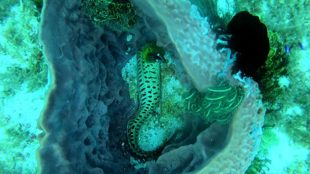 We doken op verschillende locaties rond Panglao en bij Pamilacan. Driftduiken met stroming hoorden daar soms bij, maar het tempo voelde vertrouwd. Onder water kwamen we opnieuw veel schildpadden tegen, frog fish, verschillende zeeslangen en zelfs een zeldzame gele murene.